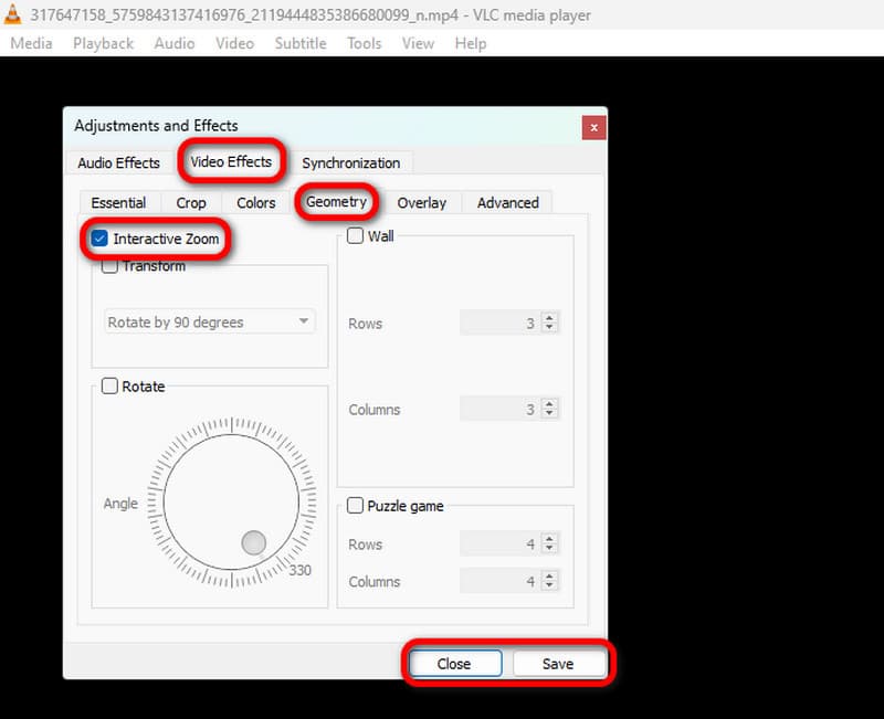 Schritt 4. Wechseln Sie im Fenster Effekte und Filter zum Bereich Videoeffekte > Geometrie. Aktivieren Sie dann Interaktiver Zoom und klicken Sie unten auf Speichern > Schließen.